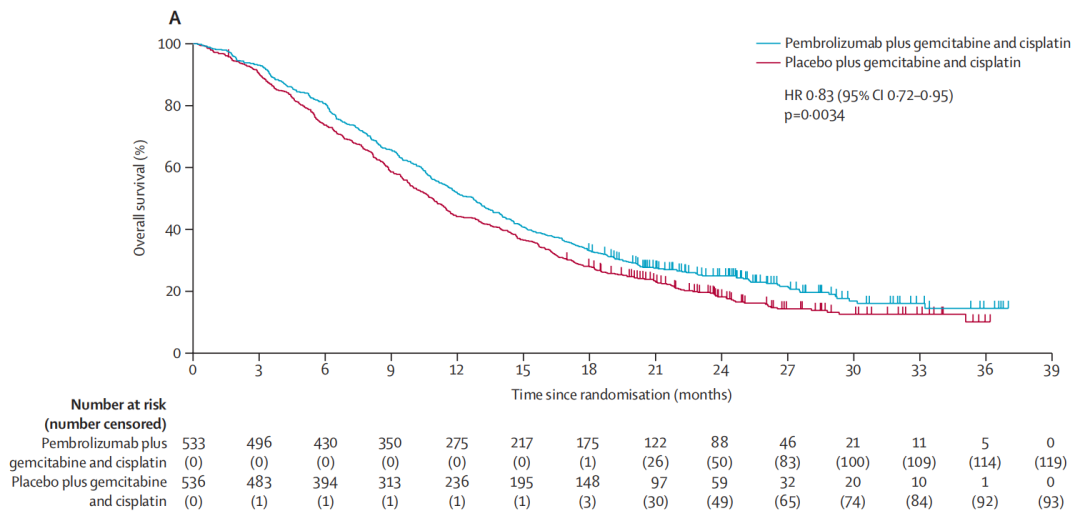 KEYNOTE-966纳入1069例之前未接受过全身治疗、ECOG表现状态为0或1、预期寿命超过3个月的转移性或不能切除的胆道肿瘤患者。研究人员随机分配患者接受200 mg帕博利珠单抗(n=533)或安慰剂(n=536)治疗(静脉注射,每3周一次最多35个周期)。所有患者还接受1000 mg/m2吉西他滨(静脉注射,第1天和第8天,每3周一次)和顺铂(静脉注射,第1天和第8天,每3周一次)共8个周期。