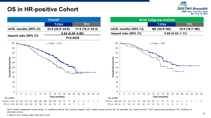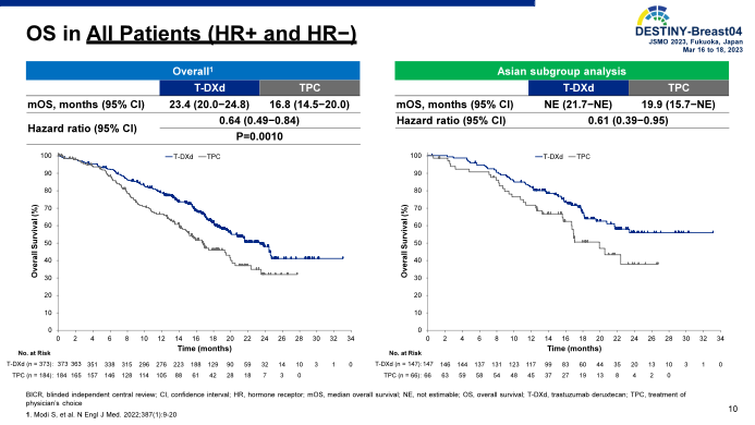 在HR+患者中,亚洲亚组的T-DXd组中位PFS相较于TPC治疗延长了5.6个月(10.9 vs 5.3个月),与整体获益一致(10.1 vs 5.4个月)。亚洲亚组的疾病进展或死亡风险显著降低59%(HR 0.41,95%CI:0.28~0.58)。