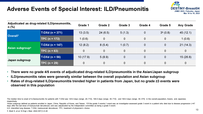 亚洲亚组及日本亚组中,T-DXd治疗期间没有4/5级间质性肺病(ILD)/肺炎发生。亚洲亚组的ILD/肺炎发生率为14.3%,但大多数(13.6%)为1/2级的轻度ILD/肺炎,与总体人群近似。日本患者ILD/肺炎的发生率较高,但无3级事件。
