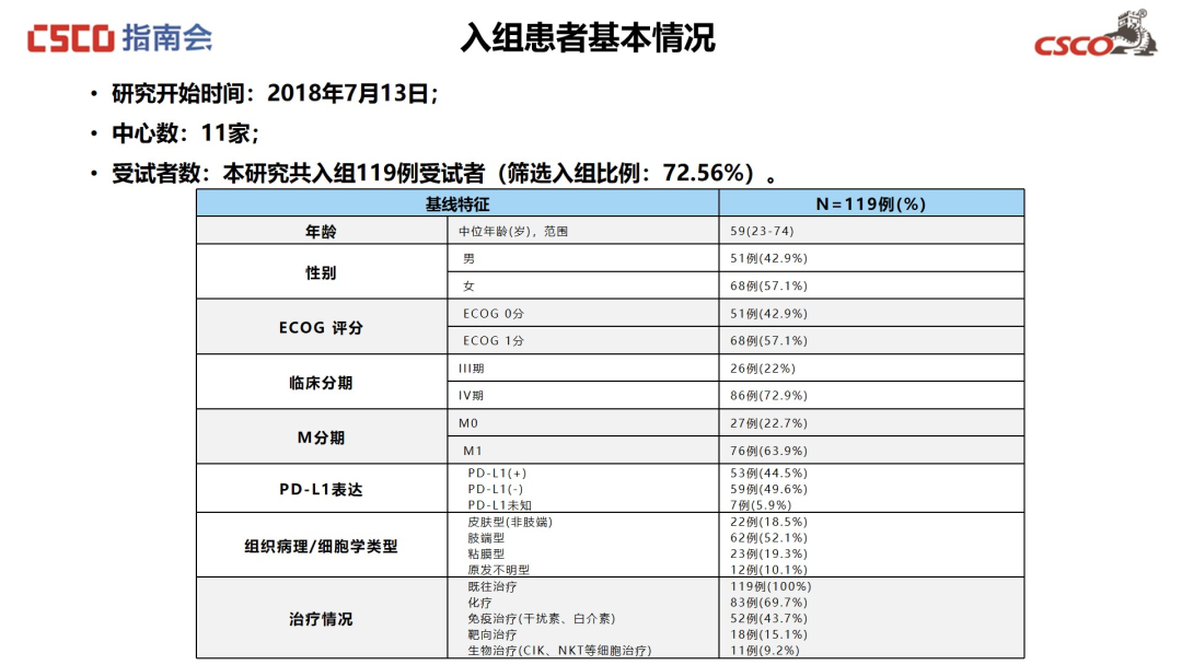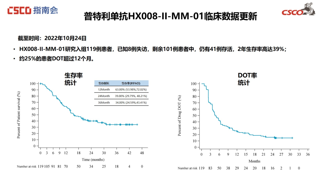 截至2022年10月24日,研究入组119例患者,已知8例失访,剩余101例患者中,仍有41例存活,2年生存率高达39%;约25%的患者治疗持续时间(DOT)超过12个月;目前仍有9例患者接受普特利单抗治疗,临床持续获益;在组患者中有8例患者持续用药超过24个月。