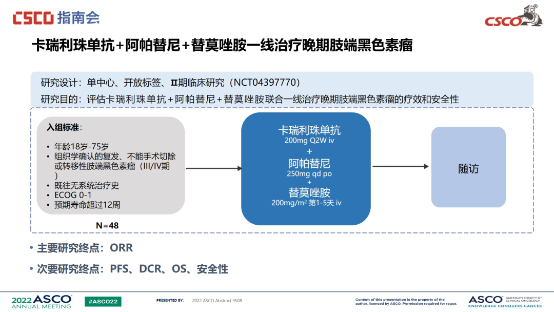 该研究为一项单中心、开放标签、Ⅱ期临床研究,旨在评估卡瑞利珠单抗+阿帕替尼+替莫唑胺联合一线治疗晚期肢端黑色素瘤的疗效和安全性。入组患者接受瑞利珠单抗(200mg,q2w,静注)+阿帕替尼(250mg,qd,口服)+替莫唑胺(200mg/m2,第1-5天静注)联合治疗。主要终点为ORR,次要终点为PFS、疾病控制率(DCR)、OS和安全性。