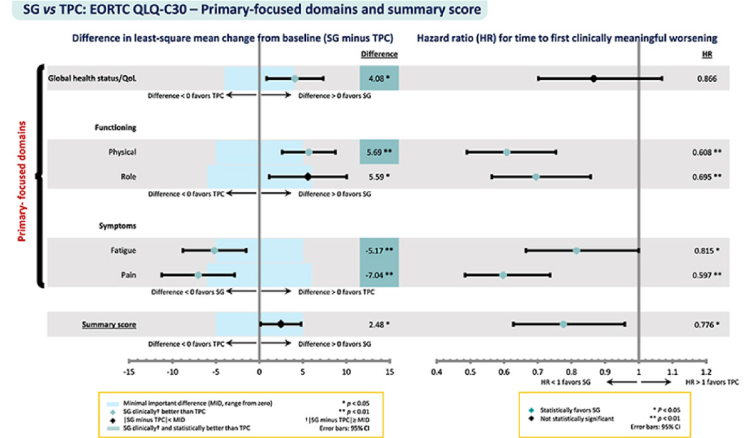 安全性方面,SG和TPC两组主要的≥3级不良反应分别是腹泻(11%vs 0.4%)和中性粒细胞减少症(52%vs 33%),两组因不良事件导致治疗中断的发生率均≤3%,安全可耐受[5]。生活质量(QoL)方面,SG较TPC在整体生存状况/生活质量(GHS/QoL)、生理机能(PF)、生理职能(RF)、虚弱、疼痛五个QoL维度的得分均具有显著改善[9]。