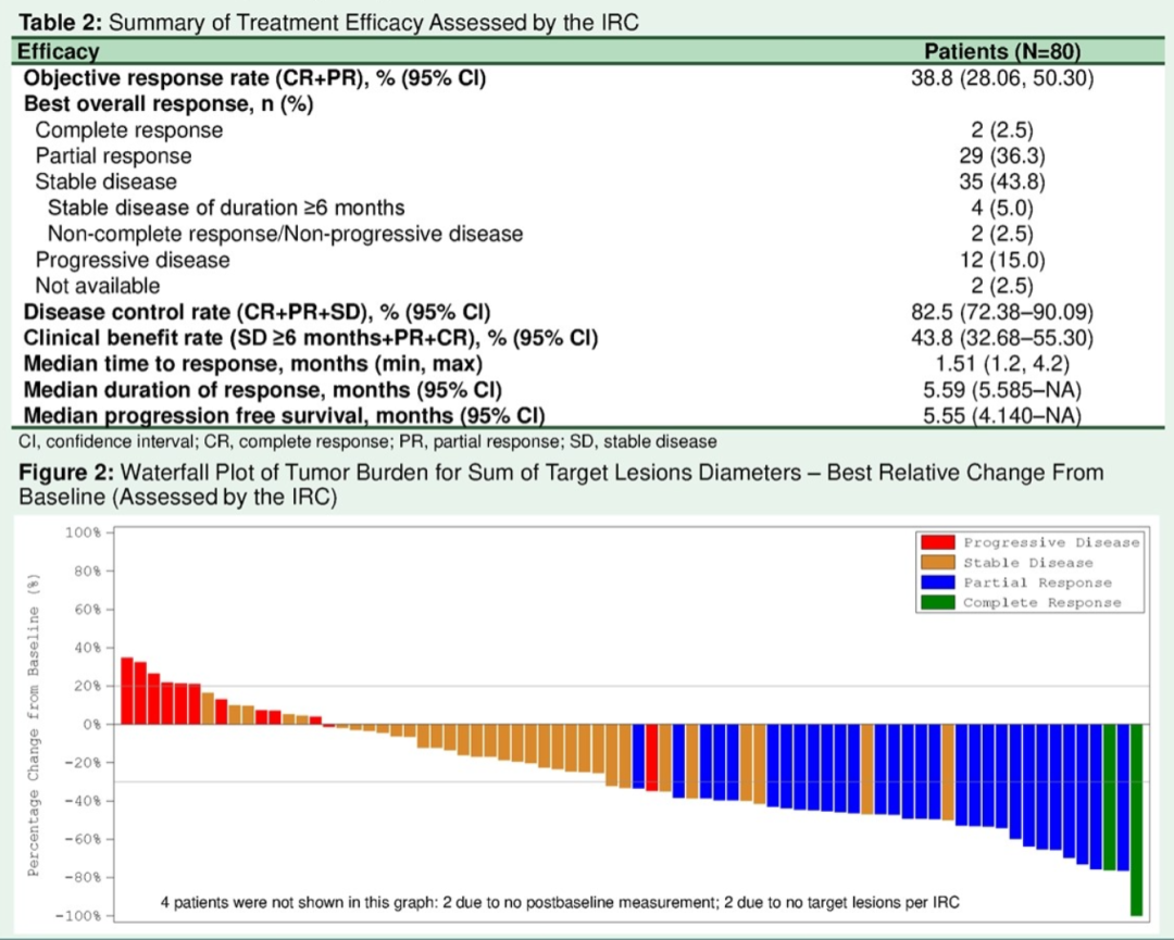 在ASCENT研究的基础上,徐兵河院士牵头的Ⅱb期、多中心、单臂EVER-132-001研究进一步探索了SG对中国TNBC患者的疗效与安全性。该研究为我国首个Trop-2 ADC临床研究,纳入经过≥2种标准治疗方案后进展的、无脑转移的局部晚期或转移性TNBC患者,予以SG治疗直至进展或者不耐受。截至2021年8月6日首次分析,80例符合条件的患者接受了≥1次的SG治疗,中位年龄47.6岁(24.0-69.9),既往接受中位4线(2-8)治疗,均为Ⅳ期乳腺癌患者,存在淋巴结、肺、骨、肝等部位转移。结果显示,独立评审中心(IRC)评估的ORR为38.8%(95%CI:28.06-50.30),临床获益率(CBR:完全缓解CR+部分缓解PR+保持稳定SD≥6个月)为43.8%(95%CI:32.68-55.30%),其中2例(2.5%)CR,29例(36.3%)PR。76.3%的患者出现肿瘤缩小,50%的患者靶病灶缩小≥30%。