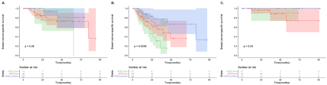 当进一步按HR状态分类时,HER2组间的生存差异仅存在于HR阴性复发患者(P=0.0006),而HR阳性复发亚组没有差异(P=0.065)。此外,在发生远处转移的HER2患者中存在显著生存差异(P=0.0039),而在LRR(P=0.26)或CBC(P=0.33)的患者中则无差异。