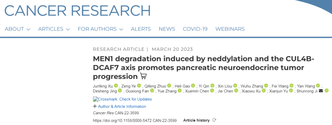 近日,由复旦大学附属肿瘤医院胰腺外科虞先濬教授和吉顺荣教授领衔的团队于《癌症研究》(Cancer Research)在线发表了题为“MEN1 degradation induced by neddylation and the CUL4B-DCAF7 axis promotes pancreatic neuroendocrine tumor progression”的研究结果,首次报道了胰腺神经内分泌瘤(PanNETs)关键驱动基因MEN1失活调控的分子机制,为针对MEN1失活突变的PanNETs患者的临床干预提供了新的策略,对于打破胰腺神经内分泌肿瘤这一罕见肿瘤治疗“瓶颈”具有重要临床转化价值。