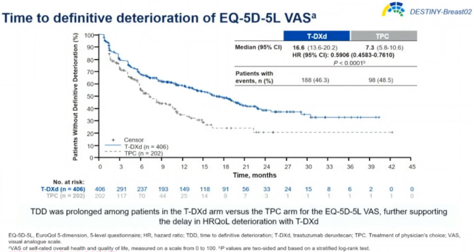 Tanja N.Fehm教授:DESTINY-Breast02研究的关键问题是德曲妥珠单抗(trastuzumab deruxtecan;T-DXd)是否会对患者生活质量造成影响。为了解答该问题,研究使用了调查问卷对患者生活质量进行评估,如EORTC QLQ-C30问卷。这是一个肿瘤特异性问卷,关注的指标包括总体健康状态、生活质量、生理、情感和社交功能,以及疼痛症状。此外,该研究还使用了EORTC QLQ-BR45乳腺癌特异性问卷,其指标包括乳房和手臂症状。第三个是EQ-5D-5L问卷,使用视觉模拟量表让患者进行健康状况的自我评估。研究的分析包括与基线相比的测量数据差异以及至明确恶化时间(TDD)。