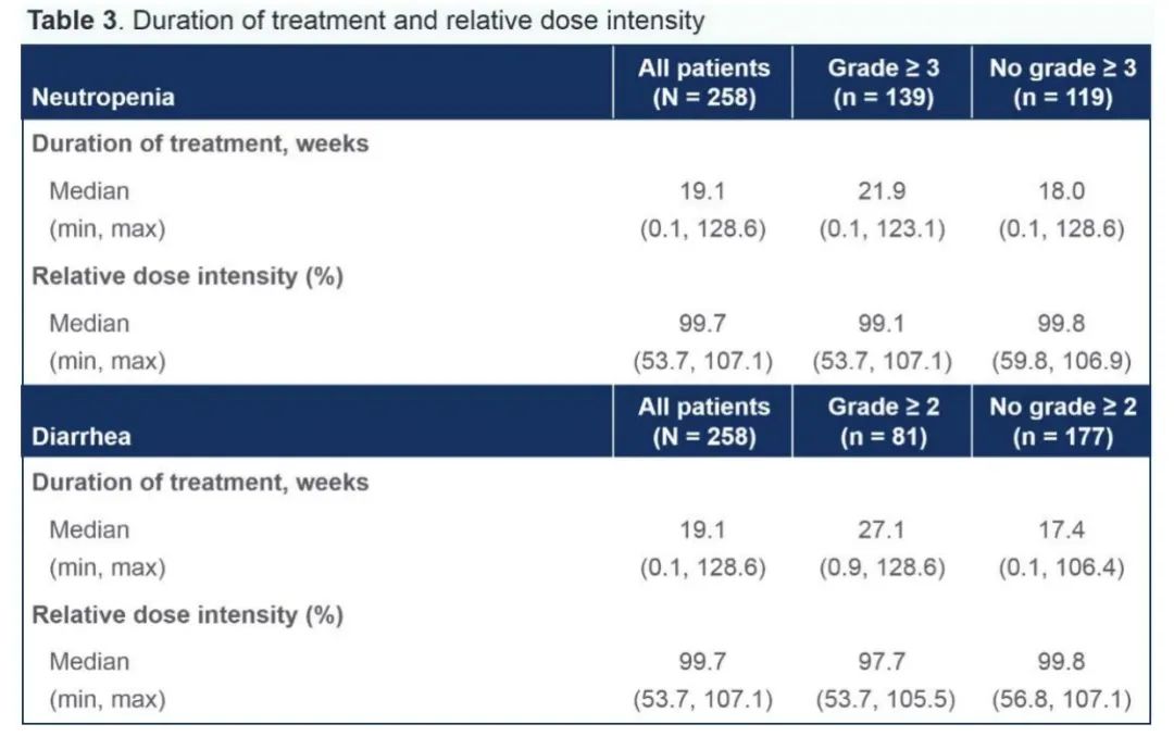 发生和未发生≥3级中性粒细胞减少的受试者,治疗持续时间和相对剂量强度大致相似(表3)。与未发生腹泻的受试者相比,发生≥2级腹泻的受试者治疗持续时间更长(27.1周vs.17.4周),而剂量强度略低(97.7%vs.99.8%)(表3)。