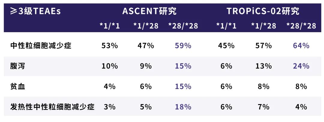 表1.ASCENT、TROPiCS-02研究不同UGT1A1状态患者SG治疗的常见≥3级TEAEs
