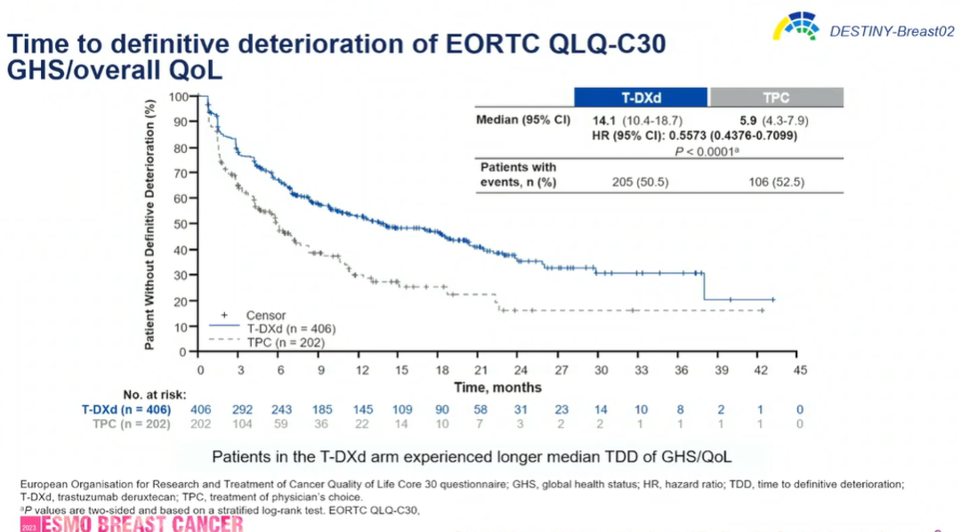殷咏梅教授:去年ESMO大会公布的DESTINY-Breast03研究中,T-DXd相较于对照组恩美曲妥珠单抗(T-DM1),在HER2阳性晚期乳腺癌中,EORTC QLQ-C30评分相关的TDD数据更长。