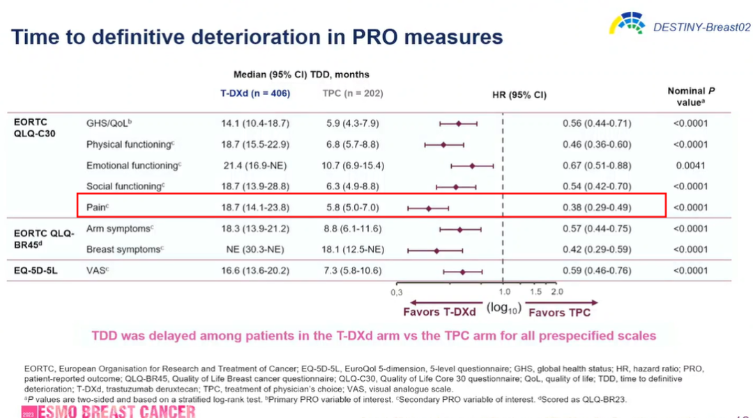在此背景下,今年ESMO BC大会上发布了DESTINY-Breast02的PRO数据。此次公布的数据主要针对T-DM1耐药的HER2阳性晚期乳腺癌患者人群,对比T-DXd和TPC的PRO。在分别经过11.3个月和4.5个月的中位治疗时间后,EORTC QLQ-C30量表的整体健康状况/生活质量评分(GHS/QoL)TDD为14.1 vs 5.9个月,HR=0.56(95%CI,0.44-0.71),且在身体功能、疼痛等方面的所有评分均有改善。
