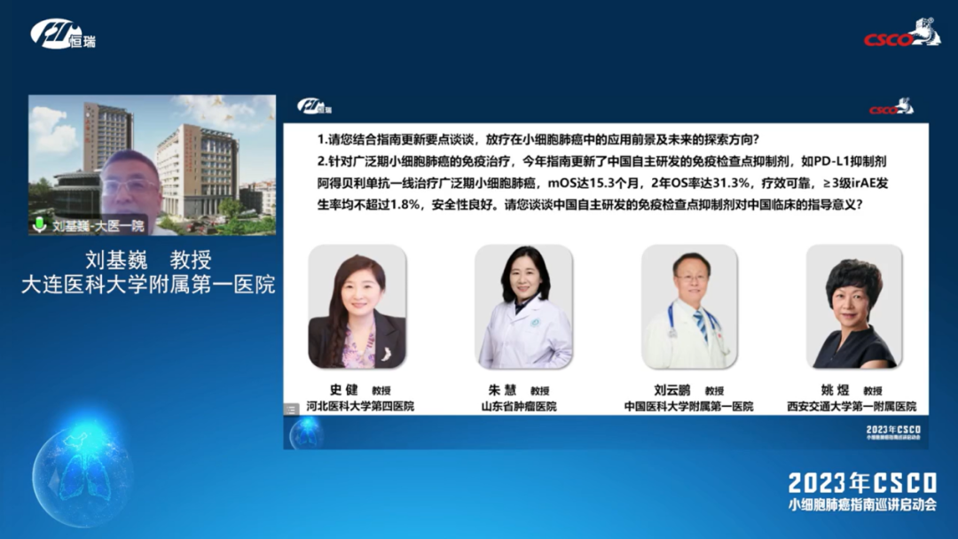 精彩的更新解读引发领域内专家强烈反响,在讨论环节中,河北医科大学第四医院史健教授、山东省肿瘤医院朱慧教授充分肯定了放疗在SCLC治疗过程中的重要价值,并就放疗在小细胞肺癌中的应用前景及未来的探索方向分享了真知灼见;中国医科大学附属第一医院刘云鹏教授、西安交通大学第一附属医院姚煜教授结合以阿得贝利单抗为代表的免疫检查点抑制剂的出色成果,重点探讨了我国自主研发的免疫检查点抑制剂对我国临床实践的指导价值,并高度称赞创新药物研发为我国广大SCLC患者带来全新、优效、可及的治疗选择。
