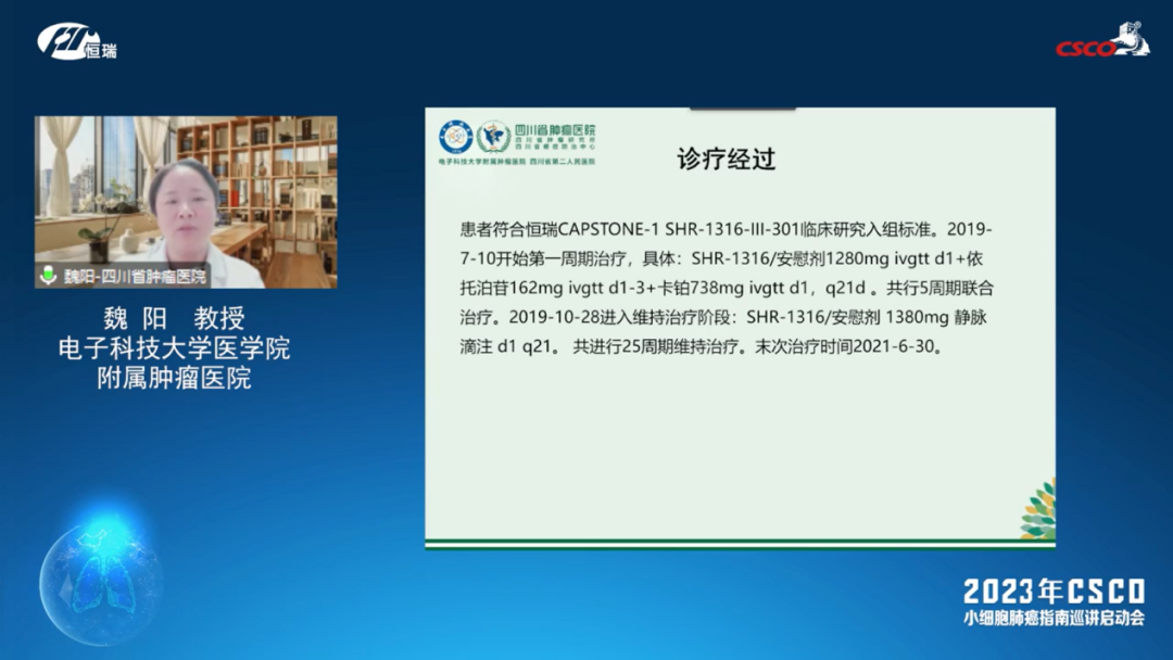 本环节,电子科技大学医学院附属肿瘤医院魏阳教授分享一位ES-SCLC患者诊疗过程。该患者经病理确诊为右肺下叶小细胞肺癌合并多发转移(cT4N3M1c,IVB期),一线治疗入组CAPSTONE-1临床研究,应用阿得贝利单抗联合依托泊苷和卡铂治疗5周期,2周期后,患者经影像学疗效评估即为部分缓解(PR),起效迅速且缓解持久。后行阿得贝利单抗维持治疗25周期。截至2023年5月,期间多次疗效评估均为持续PR,患者一线治疗PFS高达46个月且安全性良好。总体来看,本例患者一线治疗应用阿得贝利单抗联合化疗取得了满意疗效,生存获益显著且生活质量得到明显改善,充分确证阿得贝利单抗的疗效出色、安全耐受易于管理。