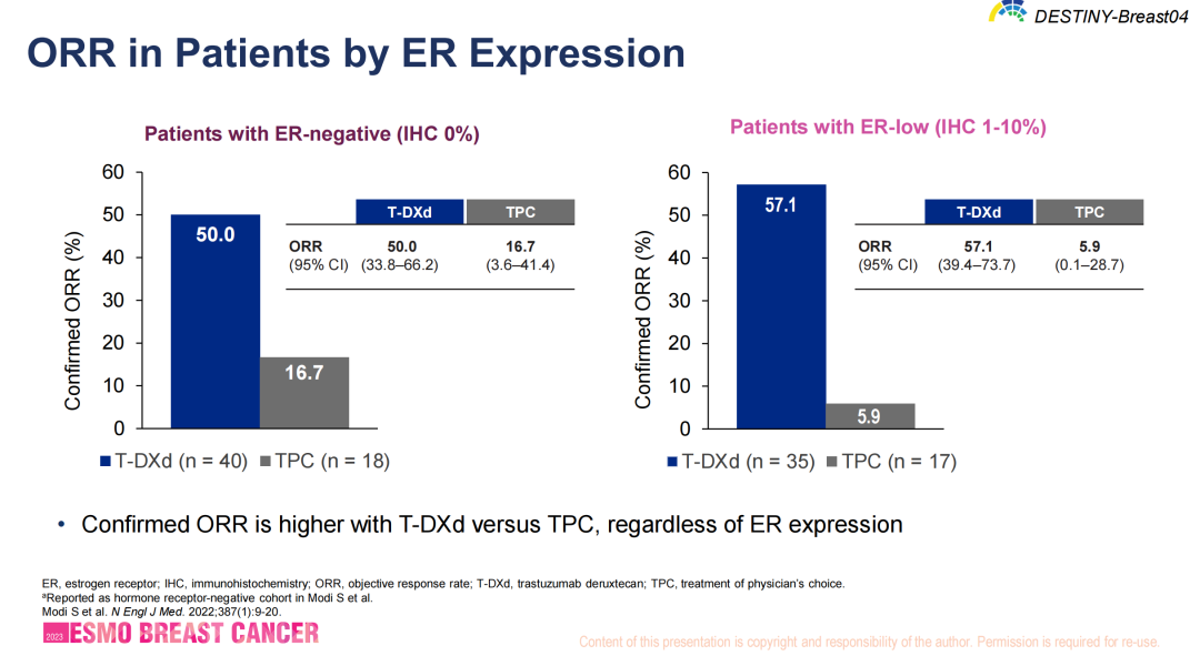 在ER 0%患者中,T-DXd组和TPC组患者的无进展生存期(PFS)分别为8.5个月和2.9个月(HR 0.46,95%CI:0.24~0.89),总生存期分别为18.2个月和8.3个月(HR 0.48,95%CI:0.24~0.95),客观缓解率(ORR)分别为50%和16.7%。