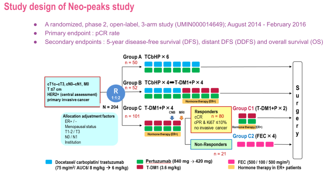 JBCRG-20(Neo-peaks)是一项日本乳腺癌研究组发起的多中心II期研究。该研究比较了在HER2阳性乳腺癌中新辅助应用多西他赛+卡铂+曲妥珠单抗+帕妥珠单抗(TCbHP)与标准TCbHP方案后恩美曲妥珠单抗+帕妥珠单抗(T-DM1+P)有效性。主要终点为pCR率,次要终点包括5年无病生存(DFS)、远处无病生存(DDFS)和总生存(OS)。
