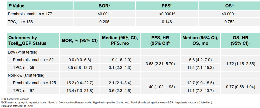 KEYNOTE-119研究评估了帕博利珠单抗(200 mg Q3W×35周期)或医生选择的单药化疗(TPC,包括卡培他滨,艾立布林,吉西他滨或长春瑞滨)二至三线治疗mTNBC的疗效。之前报道了主要研究终点结果:与TPC相比,单药帕博利珠单抗并未显著改善患者的总生存(OS)。本次进一步对入组的333名患者(帕博利珠单抗组n=177,单药化疗组n=156)肿瘤样本进行RNA测序,并应用18基因T细胞炎性基因表达谱(Tcellinf GEP)分析,证实Tcellinf GEP与帕博利珠单抗组的BOR、PFS和OS改善显著相关。