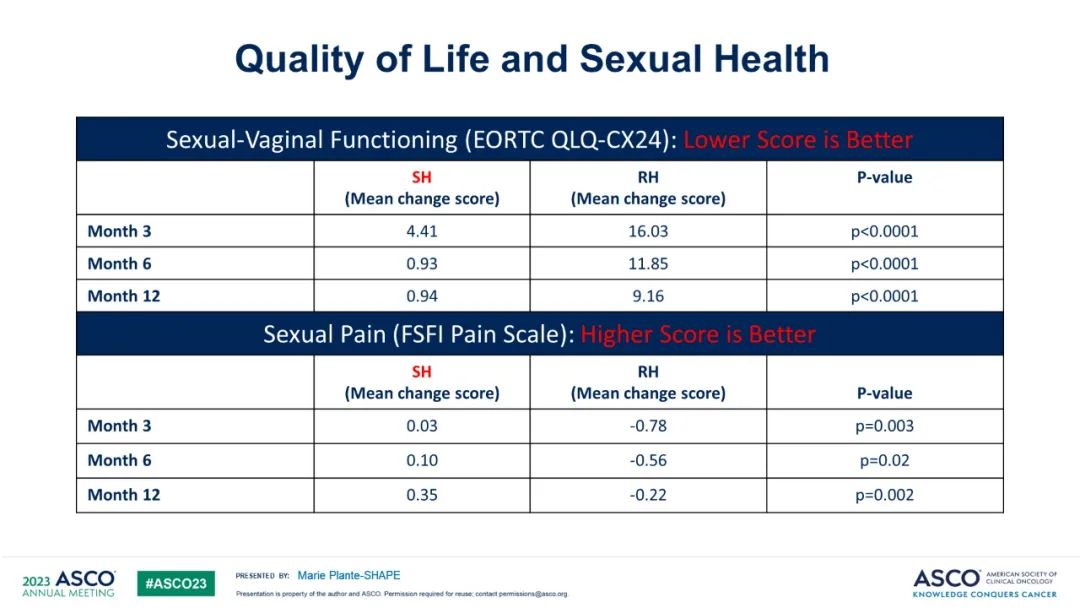生活质量和性健康也通过性阴道功能(EORTC QLQ-CX24)和性疼痛(FSFI疼痛量表)进行评估,结果有利于单纯子宫切除术组。单纯子宫切除术在3、6和12个月时改善了性阴道功能(所有P<0.0001);单纯子宫切除术组患者在3个月(P=0.003)、6个月(P=0.02)和12个月(P=0.002)时的性疼痛与根治性子宫切除术组相似。