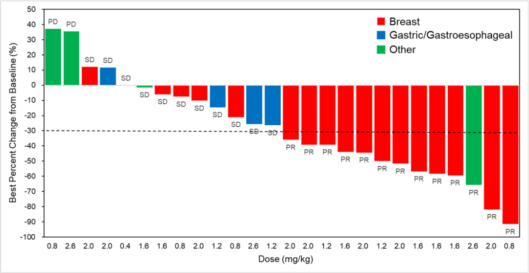 当给药剂量为0.4~2.6 mg/kg的实体瘤患者时,BB-1701耐受性良好。在所有剂量水平下均未观察到DLT。BB-1701的药代动力学谱显示,细胞毒性成分在血液中缓慢释放,使艾立布林能够有效地递送到表达HER2的肿瘤细胞及其邻近细胞。BB-1701在表达HER2的实体瘤中显示出良好的抗肿瘤活性。