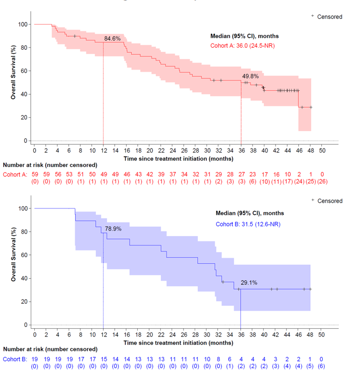 01(2023年ASCO大会摘要号:1048)即PERMEATE研究,该研究是对HER2阳性乳腺癌脑转移治疗的探索。2022年3月该研究主要研究终点结果发表于The Lancet Oncology[1],本次ASCO大会上,我们将公布其随访42.8个月的总生存数据[2]。研究更新数据显示,吡咯替尼联合卡培他滨治疗HER2阳性乳腺癌活动性脑转移,队列A(未经局部放疗的脑转移患者)的中位OS为36.0个月(95%CI:24.5~未达到)。队列B(放疗后出现疾病进展的活动性脑转移患者)中位OS为31.5个月(95%CI:12.6~未达到,图1),该研究为HER2阳性乳腺癌脑转移患者提供了目前为止文献报道的最长的总生存数据,进一步证实了吡咯替尼联合卡培他滨方案的有效性。