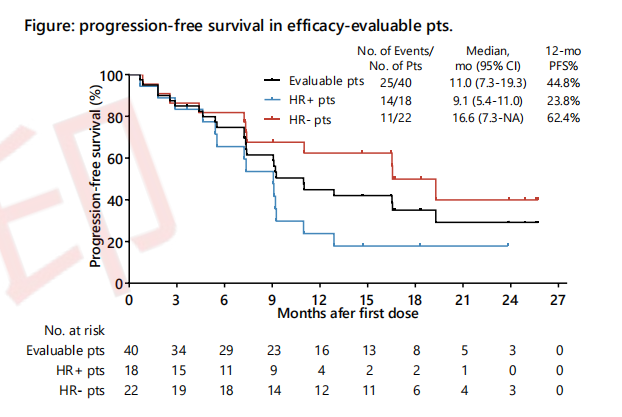 该研究入组了不愿意化疗或不适合化疗的HER2阳性乳腺癌患者,不对其HR状态进行限制。在研究证实全组患者有效性的同时,我们还发现了不同ER状态患者间的疗效差异,去年ASCO会议报道了ORR数据,此次更新数据报道PFS结果。中位随访19.2个月时,入组患者的中位PFS为11.0个月(95%CI:7.3~19.3,图2)。HR-患者的中位PFS为16.6个月(95%CI:7.3~NR),HR+患者的中位PFS为9.1个月(95%CI:5.4~11.0)。HR-患者的中位PFS虽然不成熟,但仍显示出比HR+患者更长的PFS获益趋势(图2),同时该研究也提示,HR状态不同的患者,治疗策略可能会有所不同。