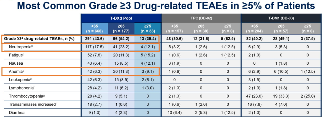 尽管临床试验和真实世界中,患者的一般情况存在一定的差异,前者受到入排标准的限制。但我们从这次ASCO报道的汇总分析来看,不同年龄患者(包括≥65岁的老年患者)都可以从T-DXd治疗中获益,而且安全性和耐受性良好。