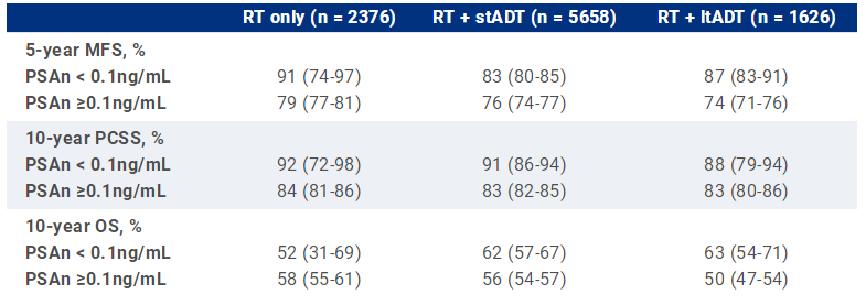 该研究纳入了16项随机对照试验(RCT)的10415例患者,RT组、RT+stADT组(RT联合3-6个月的短期ADT)、RT+ltADT组(RT联合18-36个月的长期ADT)各有2629例(25%)、6033例(58%)和1753例(17%);三组患者中分别有2339例(98%)、4756例(84%)和1258例(77%)的患者在RT完成后6个月内的最低PSA(PSAn)≥0.1ng/mL。研究结果显示,在RT+stADT组患者中,PSAn≥0.1ng/mL与更差的PCSS、MFS和OS相关(PCSS HR=1.97;MFS HR=1.27;OS HR=1.26);在RT+ltADT组(PCSS HR=1.97;MFS HR=1.58;OS HR=1.59)以及RT组(PCSS HR=1.82;MFS HR=2.23;OS HR=1.72)也有相同趋势。下表显示了三组患者完成RT后6个月不同PSAn水平患者的5年MFS、10年PCSS和10年OS。