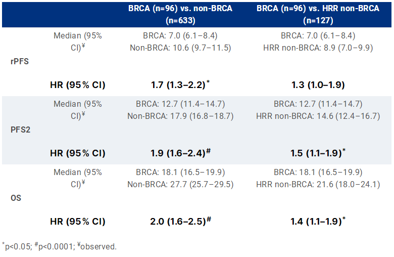 BRCA突变(包括BRCA1/2)与前列腺癌患者预后差相关,但有关同源重组修复(HRR)突变与患者预后的相关性尚缺乏数据报道。David Olmos等人报道的一项研究,对PROREPAIR-B、PROSENZA、PROSTAC和PROSABI等四项研究的患者进行配对体细胞/胚系DNA分析[6]。研究共纳入729例患者,其中223例(30.6%)为HRRm,96例(13.2%)为BRCAm。这些患者分别有60.4%和39.6%分别接受过NHT和紫衫类一线治疗;80.7%接受过至少2线治疗。配对后患者基线特征相似。研究结果显示:BRCAm患者的rPFS(HR=1.7)、PFS2(HR=1.9)和OS(HR=2.0)显著差于非BRCAm患者;BRCAm患者的rPFS(HR=1.3)、PFS2(HR=1.5)和OS(HR=1.4)同样差于其他非BRCAm的HRRm患者;而体系和胚系BRCAm患者的预后并无显著差异。