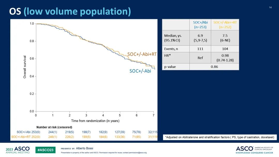 PEACE-1研究纳入1172例患者中,SOC联合放疗组为584例,不联合放疗组为588例。其中505例为低容量(0-3个骨转移+/-淋巴结),252例进行放疗,253例不进行放疗。就rPFS而言,放疗和阿比特龙间存在相互作用(P=0.026),需要进行单独分析。结果表明放疗并未改善rPFS,SOC组和SOC+放疗组分别为3年和2.6年,HR=1.12(0.68-1.85)。与SOC单独比较时,SOC+AAP+RT组的rPFS存在显著改善(7.5年;HR=0.49,P<0.0001),SOC+AAP组仅改善了临界值(4.4年;HR=0.74,P=0.066)。AAP组间的HR为0.66。OS尚未达到统计交互作用的预设阈值(P=0.11)。放疗也并未改善OS:无放疗组和放疗组的中位OS分别为6.9年和7.5年(HR=0.98,P=0.86);SOC组的中位OS为7.1年,而SOC+AAP+RT组OS尚未达到。
