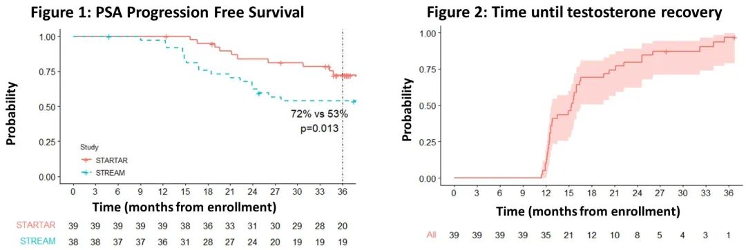 ADT联合挽救性放疗(SRT)可以改善复发性前列腺癌患者的生存,对于PSA复发的高危患者,目前的标准治疗为2年ADT联合放疗。近年来提出了引入新型内分泌治疗(NHT)的强化治疗,从而缩短全身治疗的疗程。例如今年ASCO-GU报道的FORMULA-509研究采用的是SRT联合6个月疗程的ADT+阿比特龙/阿帕鲁胺对比ADT+比卡鲁胺,但仅在PSA>0.5ng/mL亚组中有显著的PFS和MFS获益[2]。此次ASCO大会则报道了9个月疗程ADT+阿帕鲁胺联合放化疗的STARTAR研究结果[3]
