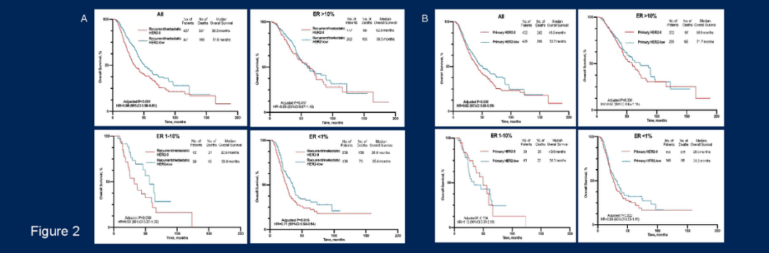根据复发/转移(而非原发)病灶评估HER2状态时,总体人群和ER阴性(<1%)亚组中,HER2-0与显著较短的OS相关(图2A)。根据原发肿瘤评估HER2状态时,我们在总体人群中观察到HER2-0和HER2低表达肿瘤之间的OS有微小但显著的差异,但在亚组中未观察到差异(图2B)。