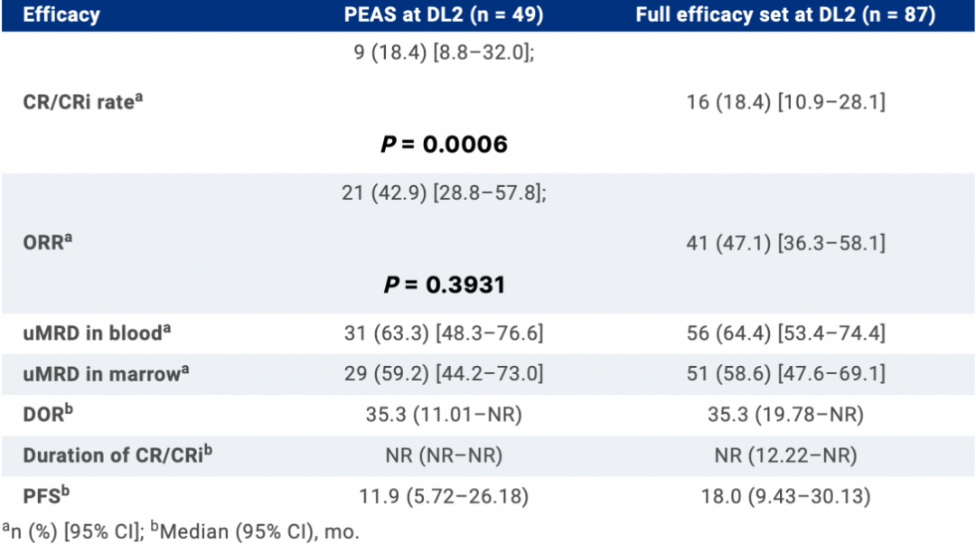 在DL2的PEAS中,CR/CRi率达到18.4%(95%CI:8.8%-32.0%),ORR率为42.9%(95%CI:28.8%-57.8%)。血液中uMRD的发生率为63.3%,在骨髓中为59.2%。中位(95%CI)缓解持续时间(DOR)为35.3个月(11.01个月–未达到),中位随访时间为19.7个月,CR/CRi的中位持续时间尚未达到。