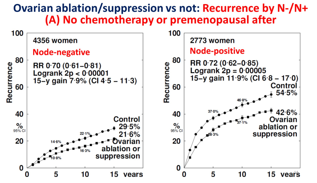 该荟萃分析提示,对于绝经前ER阳性女性乳腺癌患者,卵巢切除/抑制可显著降低乳腺癌15年复发风险和20年死亡的风险,较未切除/抑制患者取得更多获益;且无论患者年龄分层如何、淋巴结状态如何,亦能通过卵巢切除/抑制取得生存获益1。