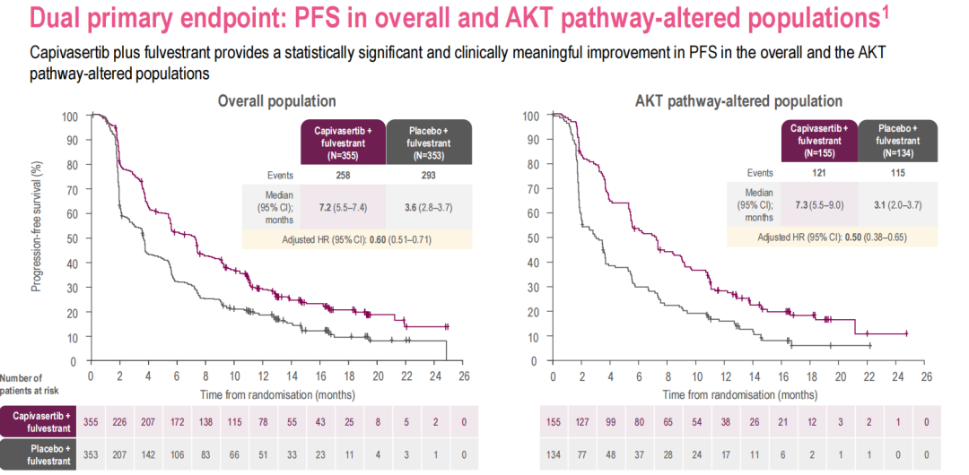该研究最终结果表明,Capivasertib治疗后AKT信号通路受到明显抑制。与安慰剂+氟维司群(P+F)相比,在总体人群和AKT通路发生改变的人群中,Capivasertib+氟维司群使患者的PFS有显著统计学和临床意义的改善。这提示我们至少可以将该方案做为AI耐药的HR+/HER2-晚期乳腺癌患者二线治疗的新标准。