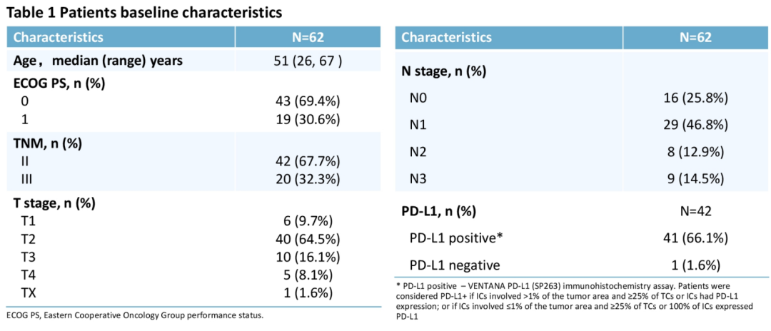 结果:从2021年3月至2022年1月,一阶段入组的32例患者中有18例实现pCR;因此继续扩大入组。至2022年10月13日数据截止时,共入组62例患者。基线特征如下表所示,Ⅱ期和Ⅲ患者分别为67.7%和32.3%,不同的T分期和N分期患者均有涉及,其中9例(14.5%)患者为N3;此外,大多数(66.1%)为PD-L1阳性,1例(1.6%)为阴性,其他PD-L1状态未知。