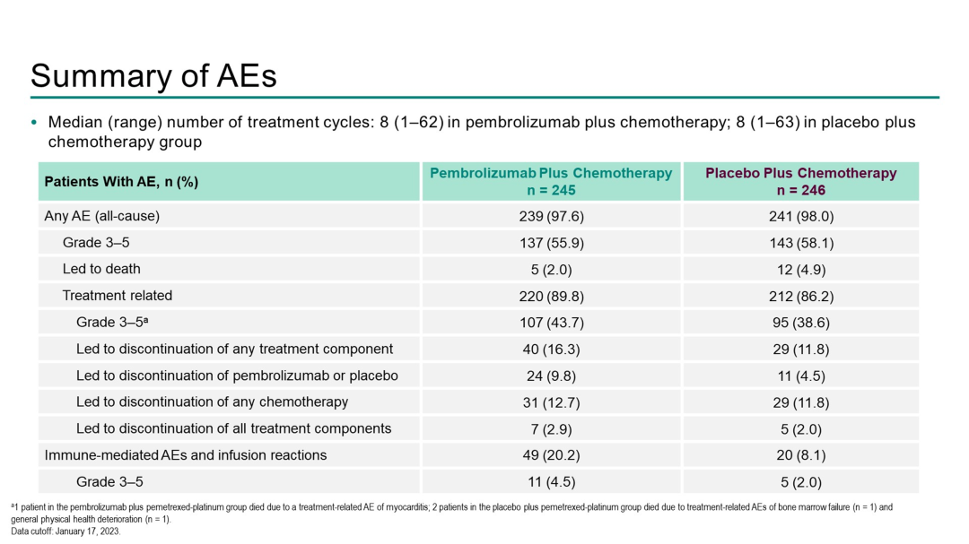安全性结局符合预期,帕博利珠单抗组的任何级别不良事件(AE)发生率为97.6%,安慰剂组为98.0%,分别有55.9%和58.1%的患者经历3-5级AE。两组分别有89.8%和86.2%的患者发生了任何级别的治疗相关AE(TRAEs),3-5 级TRAEs发生率为43.7%和38.6%。帕博利珠单抗组的免疫相关不良事件和输注反应发生率高于安慰剂组(20.2% vs 8.1%)。AE分别导致5例(2.0%)和12例(4.9%)患者死亡。