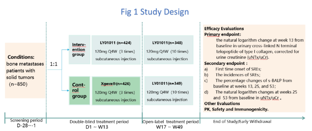 入组人群为实体瘤骨转移患者,按照1∶1比例随机分组,每四周一次接受LY01011或地舒单抗的治疗,双盲给药3次,其后两组均接受LY01011继续治疗10次。研究的主要终点为第13周尿肌酐校正的尿I型胶原交联N端肽(uNTx/uCr)较基线值变化的自然对数值;次要终点包括不同治疗阶段的血清骨特异性碱性磷酸酶(s-BALP)较基线变化、骨相关事件、安全性、免疫原性和药代动力学等。