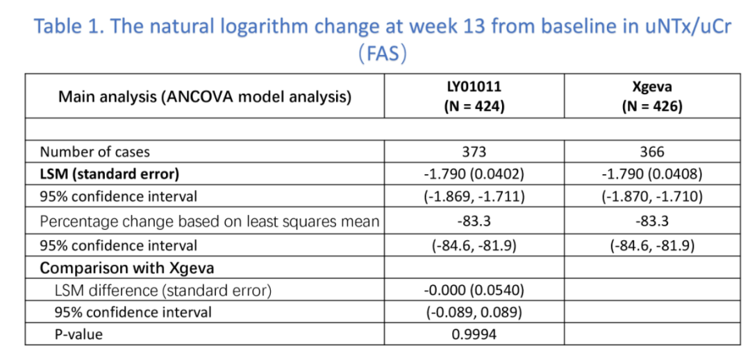 本研究共有1129例受试者参与筛选,其中850例筛选成功受试者随机分配至试验组(424例)和对照组(426例),试验组接受LY01011注射液治疗,对照组接受地舒单抗治疗。试验组和对照组第13周(LOCF)uNTX/uCr较基线值变化的自然对数值的最小二乘均值(LSM)(标准误差(SE))分别为-1.740(0.0420)和-1.745(0.0421)。两组间(试验组-对照组)差值的LSM及其90%CI为0.005(-0.088,0.097),90%CI落在方案规定的等效性界值(-0.135,0.135)范围内,达到了主要研究终点,证明LY01011与地舒单抗的临床有效性相似。