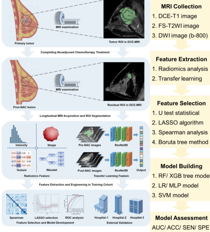 研究背景:准确识别浸润性乳腺癌经过新辅助化疗(NAC)后是否可达到病理完全缓解(pCR),对于确定合适的手术方式和指导肿瘤的切除范围至关重要。然而,目前尚缺乏可准确预测pCR的无创工具。我们的研究旨在利用时间动态的多模态磁共振(MRI)大数据,建立集成学习模型,在术前预测乳腺癌是否达能达到病理完全缓解。
