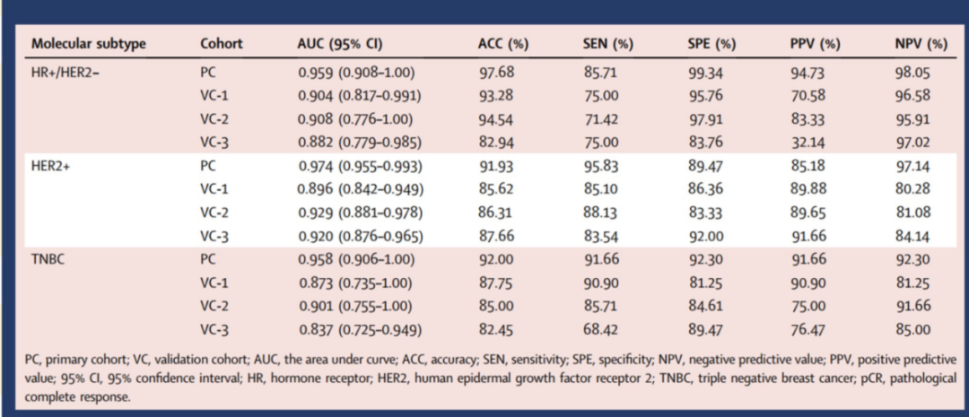 方法和材料:在本研究中,我们收集了新辅助化疗前和新辅助化疗后的多模态MRI序列,以术后病理结果判定pCR。我们从多期的磁共振图像中提取了14676个影像组学特征和4096个高维深度学习特征,并计算出反映肿瘤在新辅助化疗期间动态变化的差异化特征。在训练队列(n=409)中,使用两组间相关系数检验、U检验、Boruta特征选择和最小绝对值收缩和选择算子,选出每种乳腺癌亚型中最有意义的特征。通过交叉验证,最终我们选择20个、15个和13个图像特征分别构建HR+/HER2-、HER2+和TNBC三种亚型的神经网络模型,并利用集成学习模型用于整合单一模态的模型。我们在三个外部队列(n=343、170、340)中评估了该模型的诊断性能。