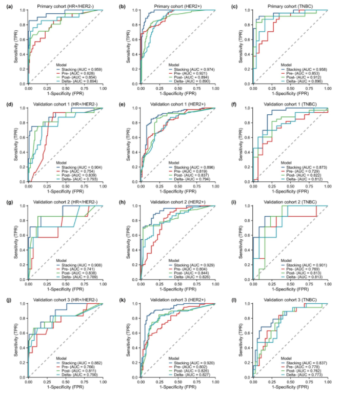 研究结果:共纳入来自四个中心的1262例乳腺癌症患者,HR+/HER2-、HER2+和TNBC亚型的pCR率分别为10.6%(52/491)、54.3%(323/595)和37.5%(66/176)。单模态神经网络模型在所有亚型中产生最佳的诊断性能,对于三种亚型,整合了新辅助化疗前、后和差异化特征的集成学习模型在训练队列中产生了最高的诊断性能,AUC分别为0.959、0.974和0.958,在三个外部验证队列中产生的AUC分别为0.882~0.908、0.896~0.929和0.837~0.901。在外部验证队列中,集成学习模型的准确率为85.0%~88.9%,灵敏度为80.0%~86.3%,特异性为87.4%~91.5%。