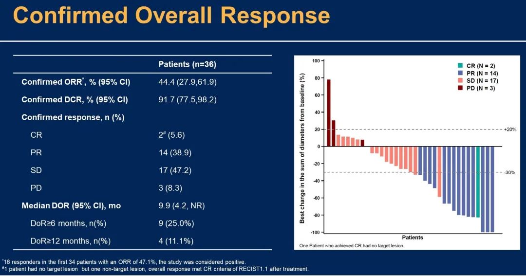 田文娟教授:很荣幸能够在今年ASCO年会的口头报告环节向大家汇报我们团队的最新研究成果。本项研究是由主要研究者复旦大学附属肿瘤医院王华英教授发起的一项单臂、Ⅱ期临床试验,采用Simon两阶段设计。在去年的ASCO大会中,我们以壁报(Poster)的形式报告了本研究第一阶段的数据,当时共入组21例患者,其中10例患者产生了应答。今年我们以口头报告的形式对最新数据进行了汇报,研究共入组36例患者,截至数据截止日,有2例完全缓解(CR),14例部分缓解(PR),总体的客观缓解率(ORR)达到了44.4%,另外还有17例为疾病稳定(SD),总体的疾病控制率(DCR)达到了91.7%,中位无进展生存期(PFS)为6.4个月,中位总生存期(OS)为21个月。的发生率为91.7%,三级以上TRAE为44.4%,免疫相关不良事件(irAE)的发生率为52.8%,总的来说,这是一个安全性良好且耐受性比较高的药物组合。