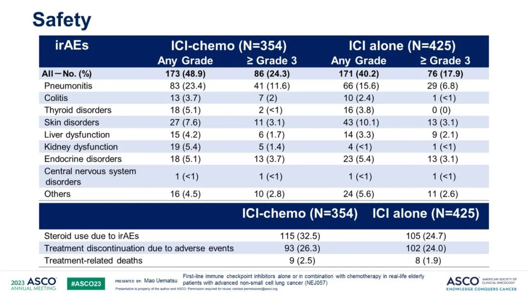 NEJ057研究发现接受ICI +化疗治疗的患者中位OS为20个月,单独使用ICI时为19.8个月,没有显著差异。这两个免疫治疗方案的中位OS都比化疗好得多,铂类双药化疗和单药化疗的中位OS分别为12.8个月和9.5个月。在毒性方面,接受ICI+化疗患者的≥3级免疫相关不良事件的发生率明显更高,相比单用ICI的≥75岁患者对类固醇的需求更大,患肺炎的可能性也更大。综上,推荐≥75岁患者接受ICI单药治疗。