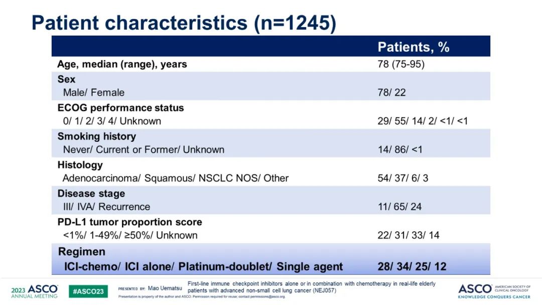 NEJ057:一线免疫检查点抑制剂单独或联合化疗治疗真实世界老年晚期非小细胞肺癌患者