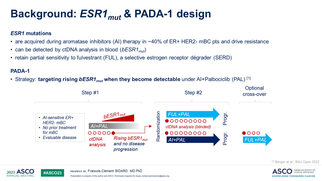 2.Bidard FC,Hardy-Bessard AC,Dalenc F,et al.Switch to fulvestrant and palbociclib versus no switch in advanced breast cancer with rising ESR1 mutation during aromatase inhibitor and palbociclib therapy(PADA-1):a randomised,open-label,multicentre,phase 3 trial.Lancet Oncol.2022;23(11):1367-1377.doi:10.1016/S1470-2045(22)00555-1