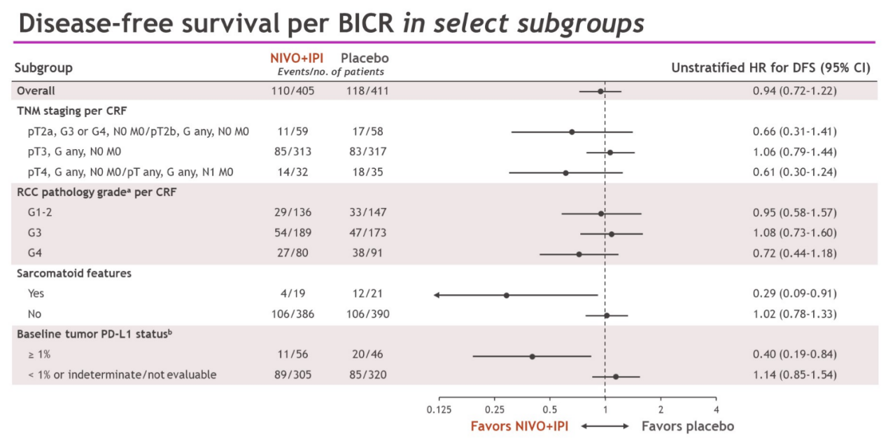 CheckMate 914试验为纳武利尤单抗联合伊匹木单抗用于中高危肾癌术后辅助治疗的随机对照3期临床研究,其中A部分采用安慰剂作为对照,纳入的肾癌人群为根治性/部分肾切除术后边缘阴性>4周且≤12周;组织学为肾透明细胞癌;pT2a(G 3/4级)N0M0、T2b-T4(任合并何级别)N0M0或任何pT(任何级别)N1M0;无病灶残留/转移。在去年ESMO会议公布结果表明,与安慰剂相比,纳武利尤单抗联合伊匹木单抗(NIVO+IPI)并未改善患者的无病生存期(DFS)[1]。本次会议公布了该研究的亚组分析结果以及相关探索性分析[2],包括TNM分期、Fuhrman分级、肉瘤样特征(是/否)、PD-L1表达和NIVO+IPI治疗周期数(≤6个周期[1–2剂IPI]vs>6个周期[3–4剂IPI])。结果显示:816例患者随机进行NIVO+IPI(N=405)或安慰剂(N=411)辅助治疗。在37.0个月中位随访时,亚组分析表明,相比于安慰剂,肉瘤样分化特征或PD-L1表达≥1%的受试者能从NIVO+IPI辅助免疫治疗中获益。