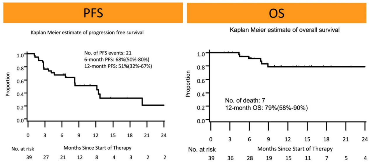 中位随访10.4个月,39例可评估患者中,有13例(34%)N+I≤2个周期、9例(23%)3个周期、17例(44%)4个周期;共有24例患者接受了NIVO维持治疗(其中15例接受了4个周期N+I诱导治疗);有28例(72%)患者发生卡博替尼剂量减半至20mg qd、7例(18%)减至20mg隔日。在这39例患者中,有7例(18%)患者达到PR,而且7例患者均为一线治疗(PR率为21%)。6个月和1年PFS率分别为68%和51%,1年OS率为79%。常见的≥3级TRAEs为ALT升高(36%)、AST(23%)、心脏毒性(10%)以及血小板降低、低钠血症、高血压、肌酐升高、乏力、口腔黏膜炎(均为5%)。没有发生5级不良事件。