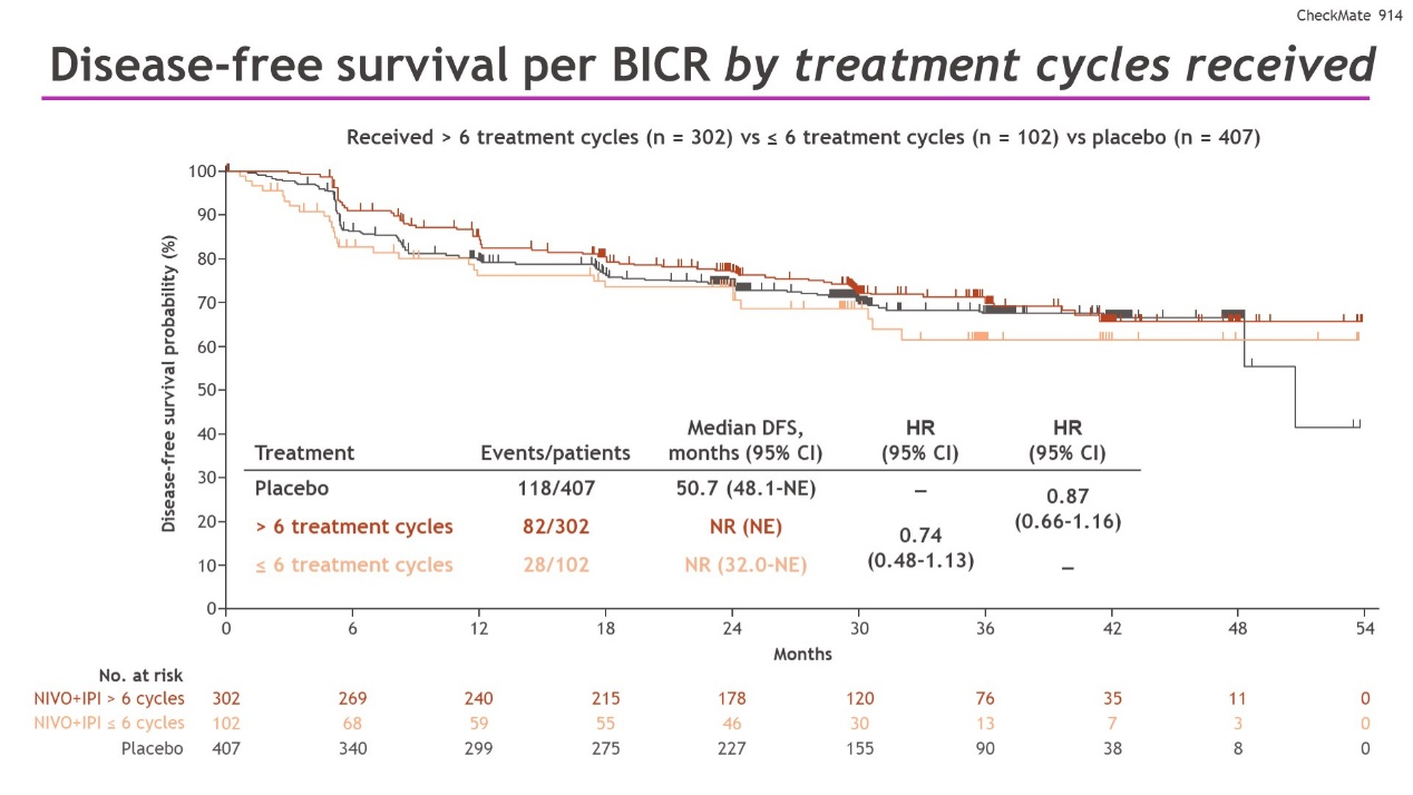 关于治疗周期数方面,与NIVO+IPI治疗周期数≤6个周期的患者相比,治疗时间>6个周期受试者的DFS具有改善趋势。分析NIVO+IPI治疗≤6个周期的102例患者,其中3%具有肉瘤样特征,20%为Fuhrman 4级;治疗终止原因主要为药物毒性(75%)、再看这102例患者的安全性分析,35%发生了1-2级AE事件,≥3级的患者为63%;31%的患者因1-2级AE事件而停止治疗,因≥3级AE事件停药的患者为44%。