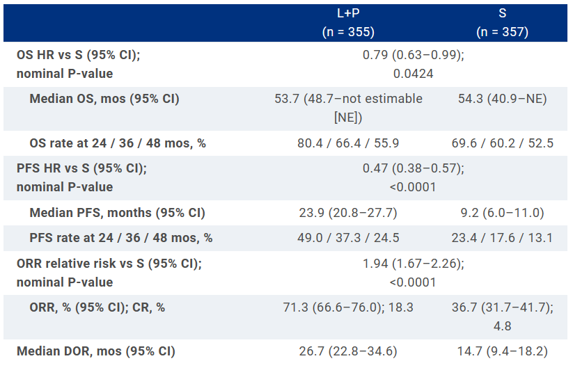 无进展生存时间方面,L+P组PFS获益仍优于S组,两组分别达到23.9与9.2个月(HR=0.47,95%CI:0.38–0.57)。基于MSKCC危险分层分析,低危患者中L+P组的PFS获益优于S组,分别达到28.6与12.9个月(HR=0.50,95%CI:0.35–0.71),中高危患者中L+P组的PFS获益同样显著优于S组,分别达到22.1与5.9个月(HR=0.43,95%CI:0.34–0.55)。对于ORR而言,L+P获益(71.3%;CR 18.3%)相较于S组(36.7%;CR 4.8%)更优(RR=1.94,95%CI:1.67–2.26)。L+P组与S组后续治疗中分别有56(15.8%)例和195(54.6%)例分别接受了PD-1/PD-L1检查点抑制剂。L+P组PFS2更长(43.3 vs 25.9个月;HR=0.63,95%CI:0.51–0.77)。≥3级的治疗相关不良事件分别为74.1%和60.3%。研究表明,仑伐替尼联合帕博利珠单抗在OS、PFS、ORR和CR方面持续展示出比舒尼替尼更好的临床获益。