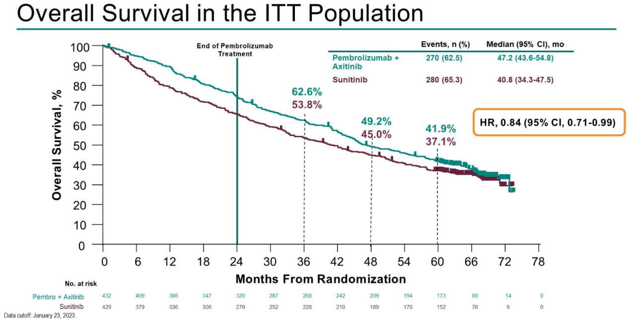 此次长期随访的数据显示,PFS、ORR和DOR等数据基本上与既往报道一致,主要在OS方面有所变化,阿昔替尼联合帕博利珠单抗治疗组的中位生存时间达到47.2个月,舒尼替尼治疗组达到40.8个月,5年OS率分别为41.9%和37.1%;相对于舒尼替尼治疗组,阿昔替尼联合帕博利珠单抗治疗具有生存获益(HR=0.84,95%CI:0.71–0.99)。无进展生存分析方面:阿昔替尼联合帕博利珠单抗治疗组达到15.7个月,舒尼替尼治疗组达到11.1个月,两组具有统计学差异(HR=0.69,95%CI:0.59–0.81)。