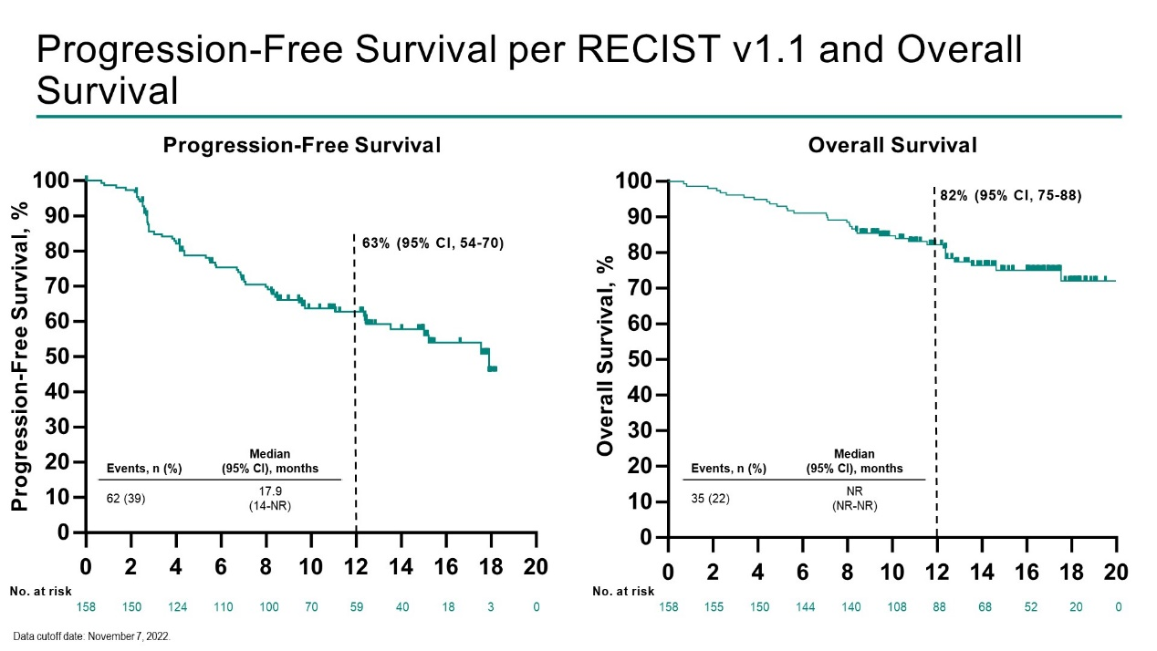 此次分析的患者比上次增加了11例(n=158),中位随访时间约15个月,总体上ORR、DCR等疗效与上次分析的结果相似(见下图),ORR和DCR分别为49%和82%,且乳头状(49%)、嫌色细胞(28%)、未分类(52%)、Xp11.2易位(67%)等不同组织类型均有不错的ORR。中位PFS和OS分别为17.9个月(95%CI,13.5-NR)和NR(95%CI,NR-NR)(数据尚未成熟);1年PFS和OS分别为63%和82%。