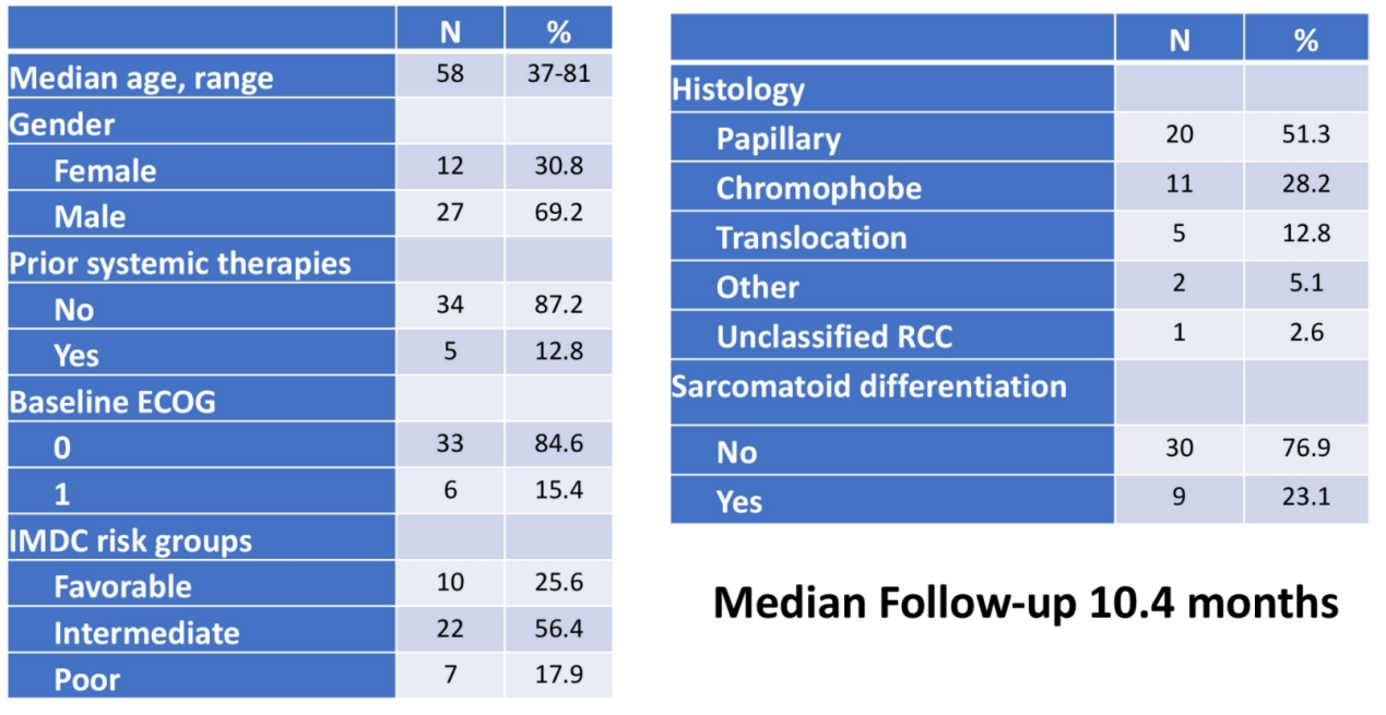 2022年ESMO会议报道了卡博替尼联合双免疫用于晚期中高危肾透明细胞癌一线治疗的随机对照Ⅲ期COSMIC-313研究证实卡博替尼联合NIVO+IPI(C+N+I)的三药方案用于ccRCC可以改善PFS和OS,本次ASCO大会报道了一项C+N+I用于晚期非透明细胞癌的多中心、前瞻性、单臂、2期试验[9]。给药方案(先4个周期C+N+I诱导治疗/其中N+I为q3w,然后C+N维持治疗/其中N改为q4w)和基线特征如下图所示。研究共入组39例患者,其中乳头状20例(51.3%)、嫌色细胞11例(28.2%)、基因易位5例(12.8%)、其他2例(5.1%)、未分类1例(2.6%);低危10例(25.6%)、中位22例(56.4%)、高危7例(17.9%);大多数患者(34/39)没有接受过既往治疗。